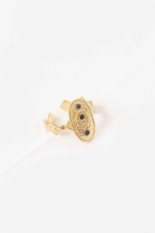 An oval charm design with three black stones and a diamond-shaped gold band design.
