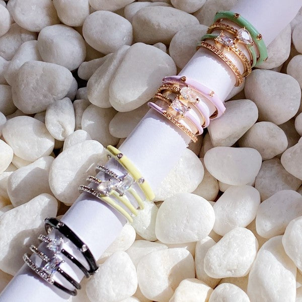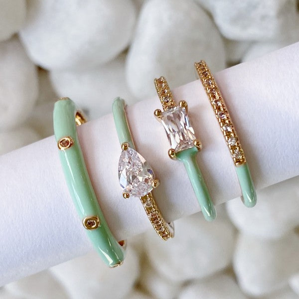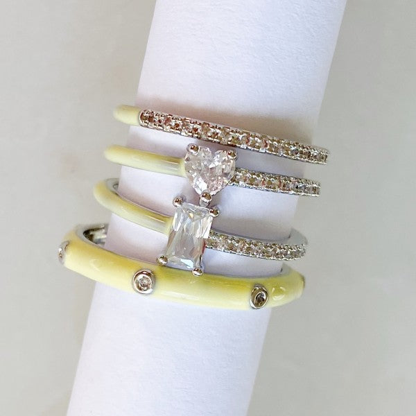 Beautiful 4 rings come in this set. 3 rings in size 5, 1 ring in size 7. Can be worn together or separately. Each ring has pretty design with enamel and rhinestone details.
