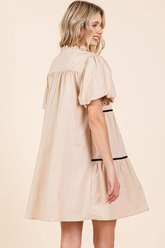 Vestido mini babydoll con detalles de ribetes.