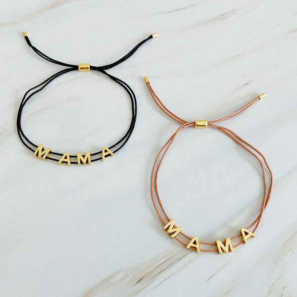This beautiful MAMA bracelet is made of a slim satin thread with simple golden font MAMA. Its clean, minimalist design features adjustable drawstring size for easy fitting, with each letter that moves independently around the thread. Perfect for the fashionable, yet understated, mother.