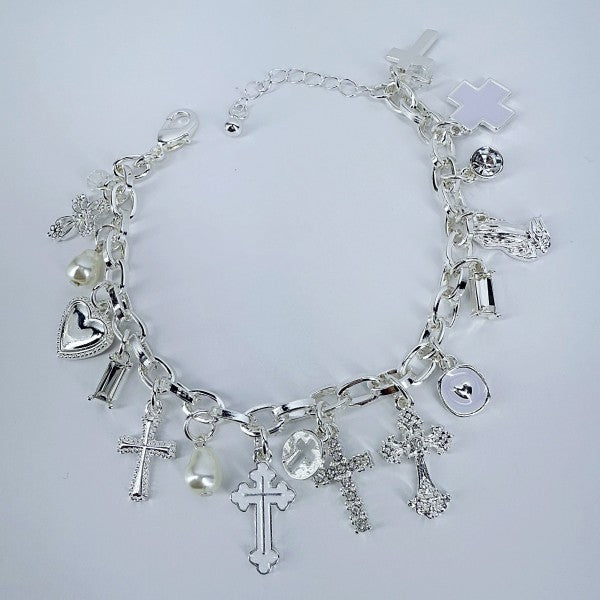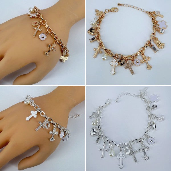 Enhance your wrist with this gold or silver chain bracelet adorned with multiple charms, including hearts, crosses, and sparkling rhinestones, offering a stylish and meaningful accessory for any occasion.