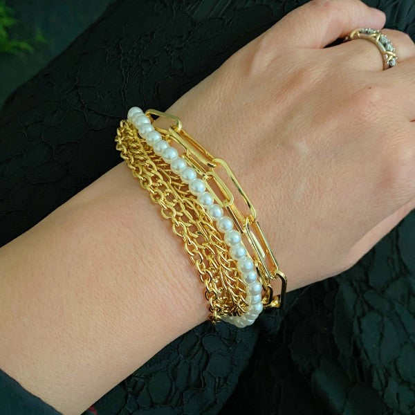 Trendy chains are all together to make a fun statement piece with a strand of pearls.