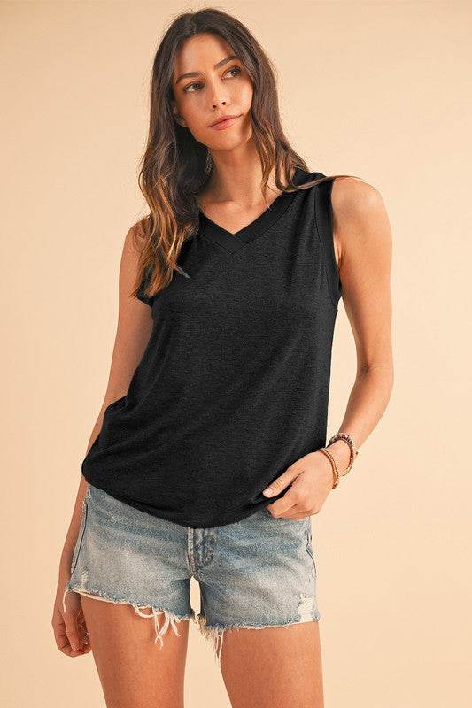 It features a ribbed v neck, cool sleeveless silhouette