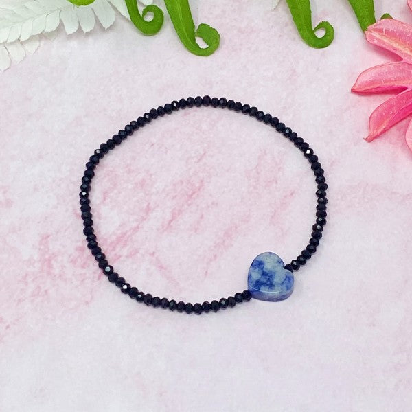 This Semi-Precious Heart Stretch Bracelet offers the perfect blend of comfort and style. Its stretchable design is comfortable to wear, and the tiny black glass beads create a stunning contrast with the beautiful natural stone center pendant. An ideal accessory for any wardrobe, this stretch bracelet can be worn alone or layered with other bracelets for an eye-catching look.