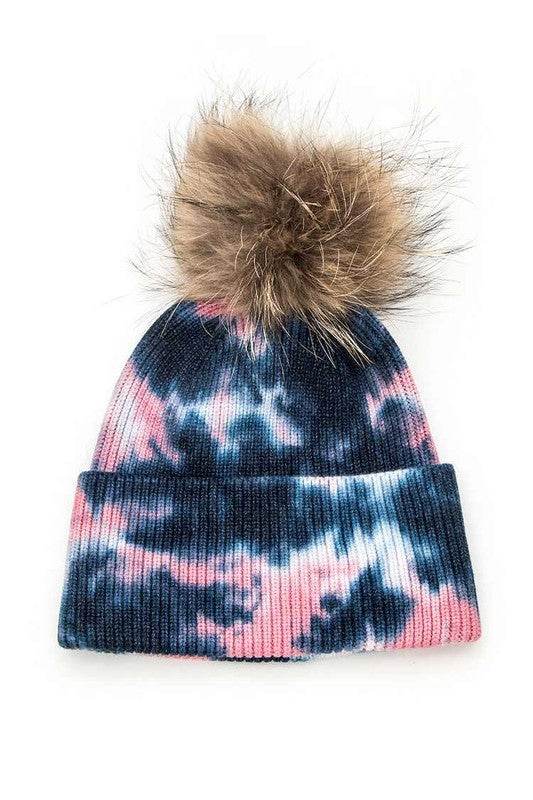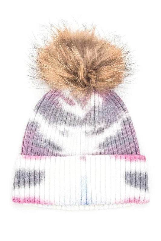 Tie Dyed Natural Natural Genuine Fur Pom Beanie