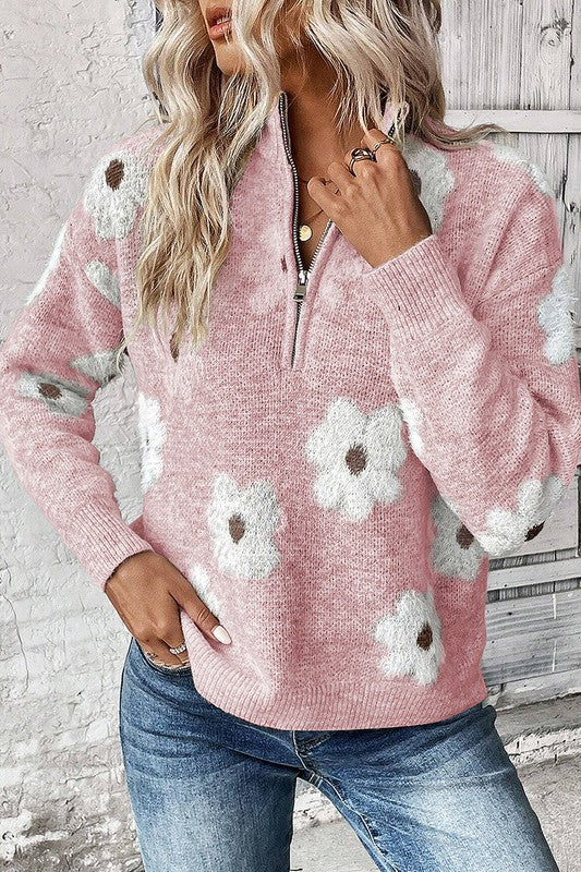 Women Floral Pattern Zip Drop Shoulder Sweater
